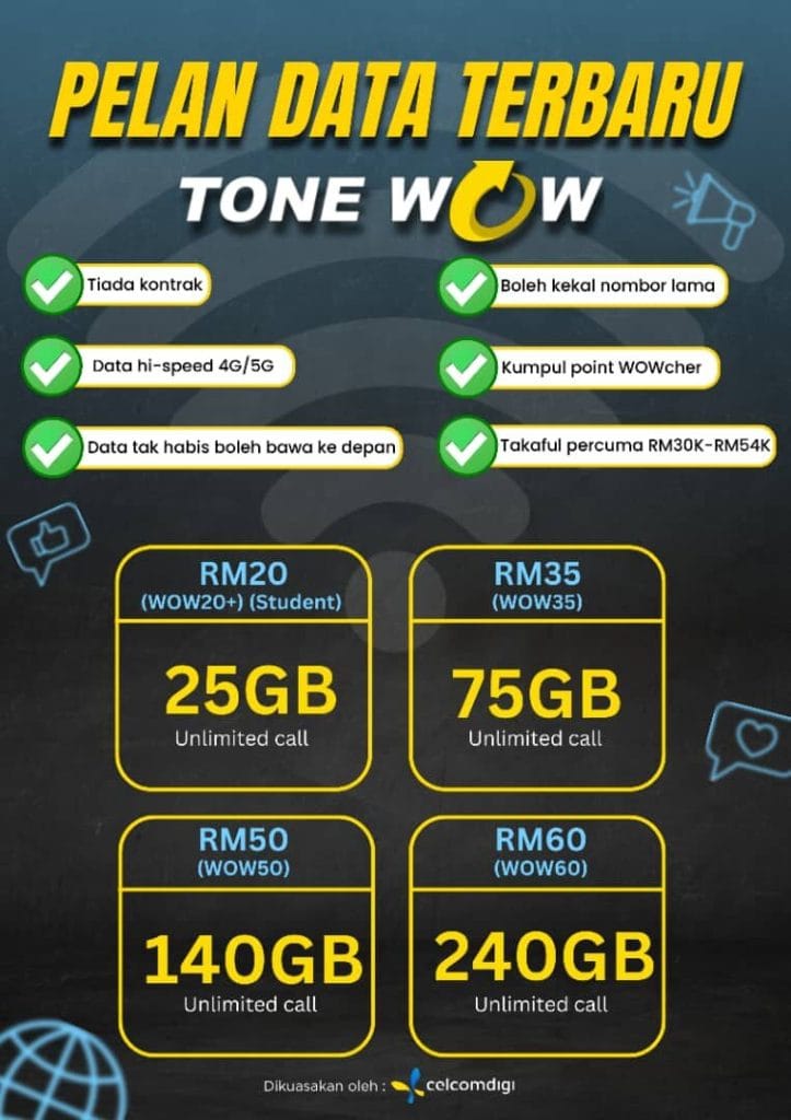- Pelan data Tone Wow RM35, RM50 atau RM60